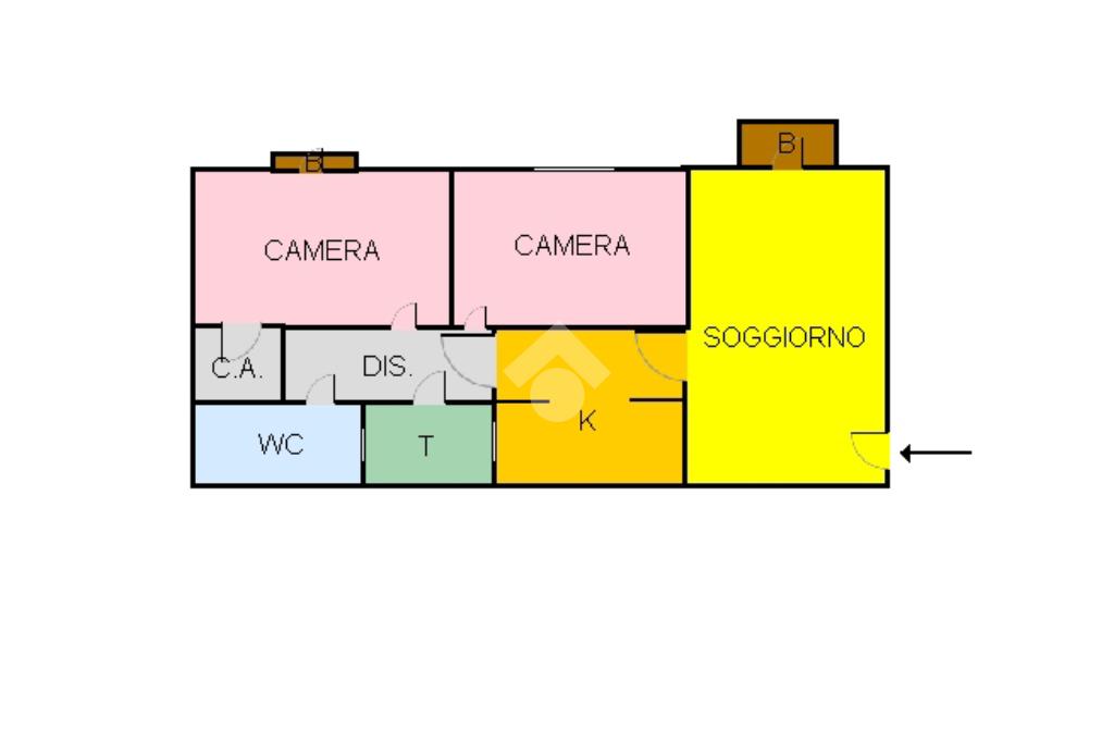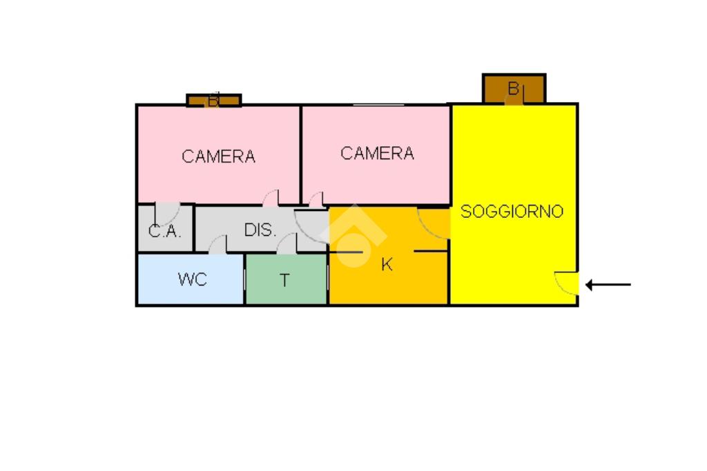 Esso si compone di ingresso su soggiorno con annesso angolo cottura e balconcino, disimpegno che divide le due camere da letto, di cui una con cabina armadio, il wc-doccia ed un piccolo pozzo luce.